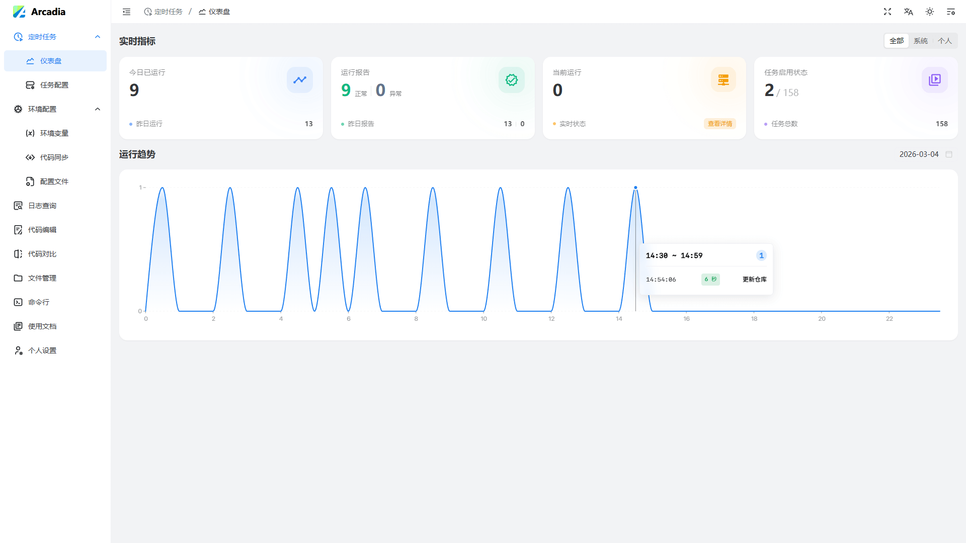 多维监控仪表盘实时呈现任务运行状态与历史趋势,可快速定位异常与优化调度策略。运行趋势可查看数天内的任务执行情况。